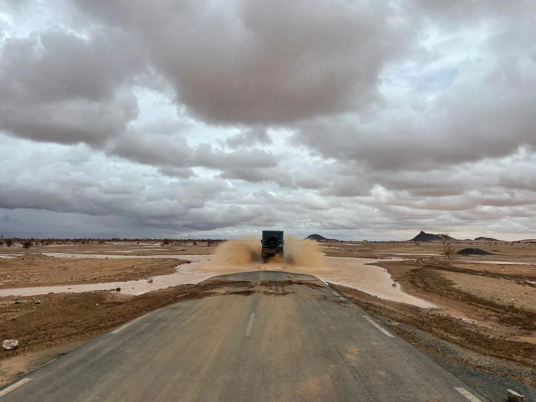 Nach unserer letzten Offroad Tour entlang der Eisenbahnlinie wurden wir kurz vor der Wüstenstadt Atar von den Auswirkungen der heftigen Regenfälle überrascht. Das erste Mal seit ca. 5 Jahren fiel hier in der Region der erste Regen und es wurden die Himmelsschleusen geöffnet.